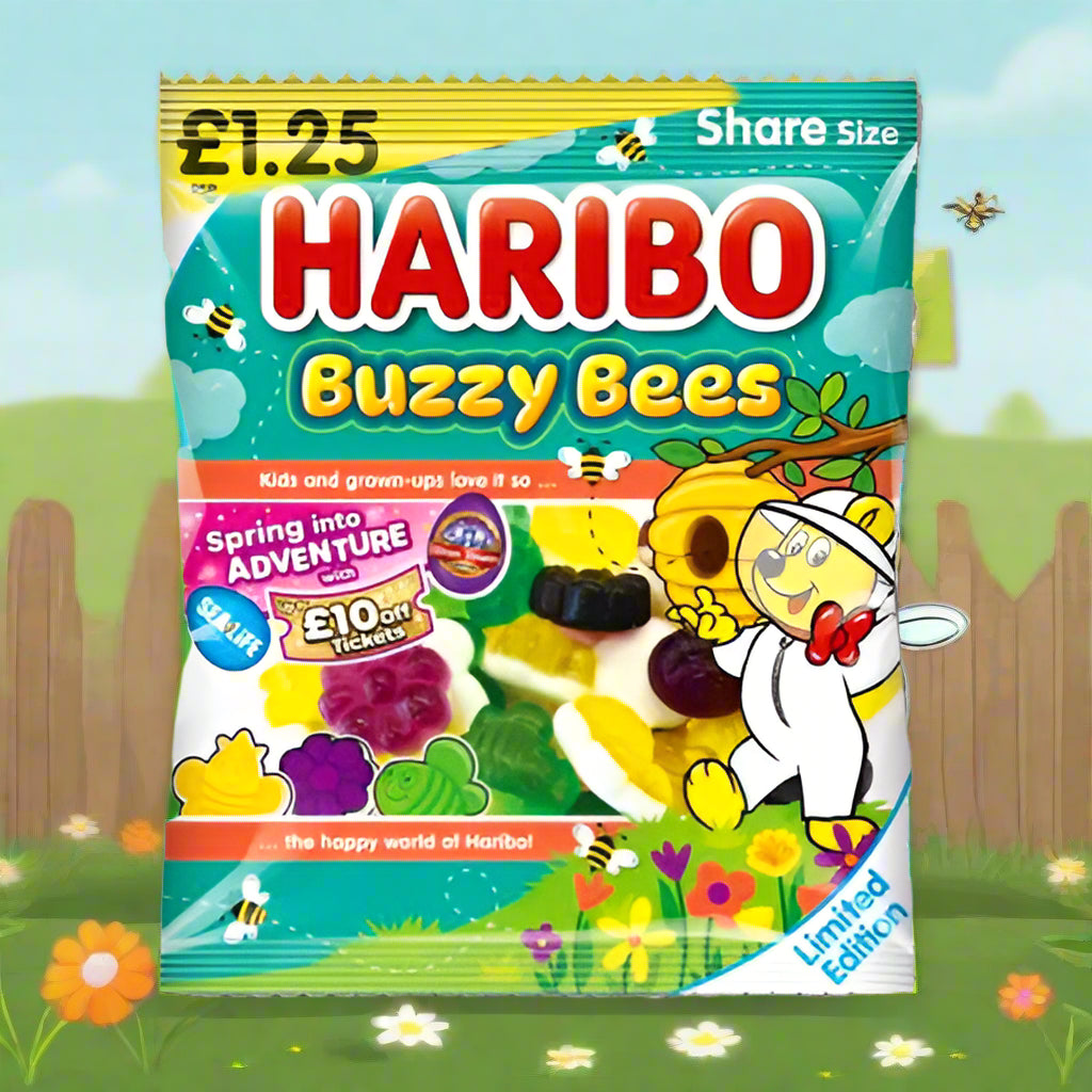 Get a buzz of delicious flavor with Haribo Buzzy Bees PM £1.25 Share Bag 140g. Treat yourself to a sweet and playful experience with these cute, bee and flower shaped gummies. Perfect for sharing with friends and family or keeping all to yourself (we won't judge).