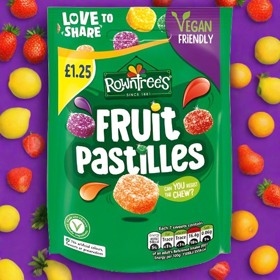 Indulge in deliciousness and conscience with Rowntree's Fruit Pastilles Vegan Friendly Sweets! Mouth-watering fruity flavors and guilt-free ingredients make this 120g sharing bag a must-have. Satisfy cravings without compromising values for only £1.25! (Go ahead, treat yourself!)